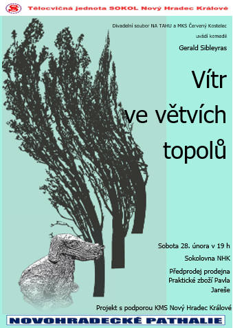 V sobotu 28. února uvidíme v podání červenokosteleckého souboru Na tahu hru Vítr ve větvích topolů, jejíž text byl ověnčen cenou L. Oliviera jako nejlepší komedie roku 2006.
